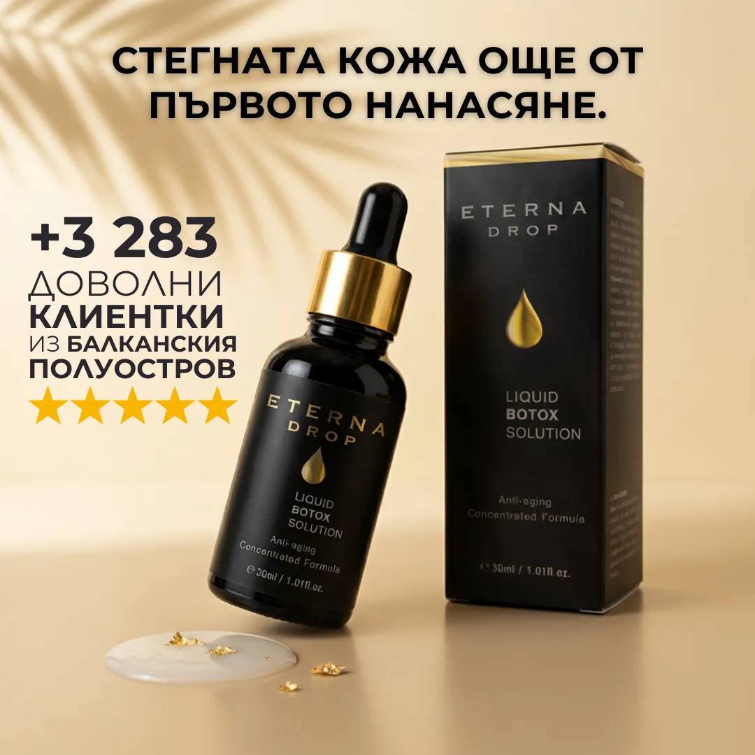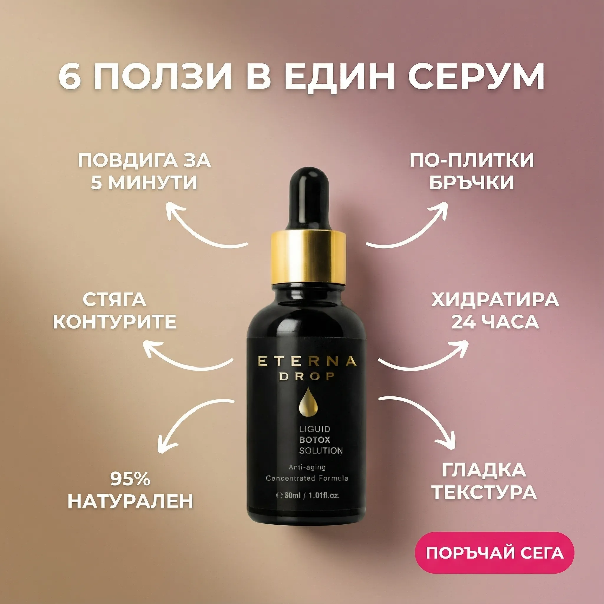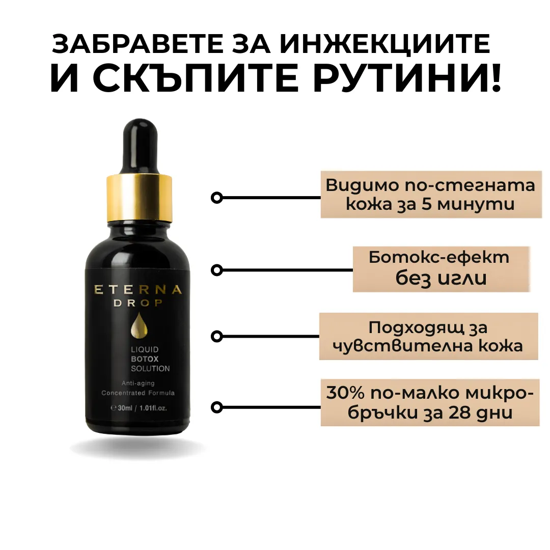 Представяме ви серума на: Eterna Drop Liquid Botox Solution научно формулиран да се бори с разпада на колагена и да трансформира кожата Ви по начини, които никога не сте мислили за възможни: