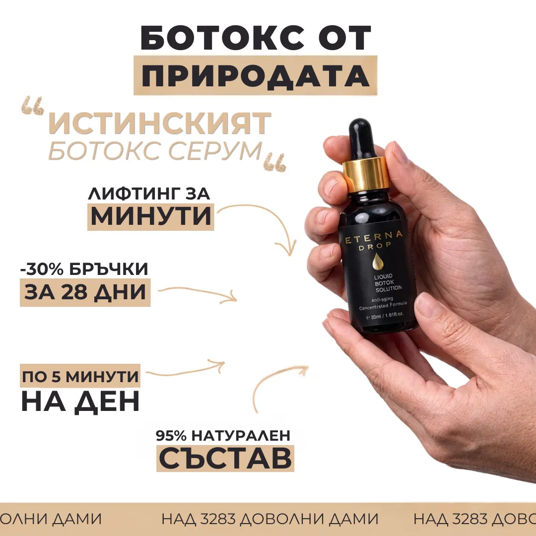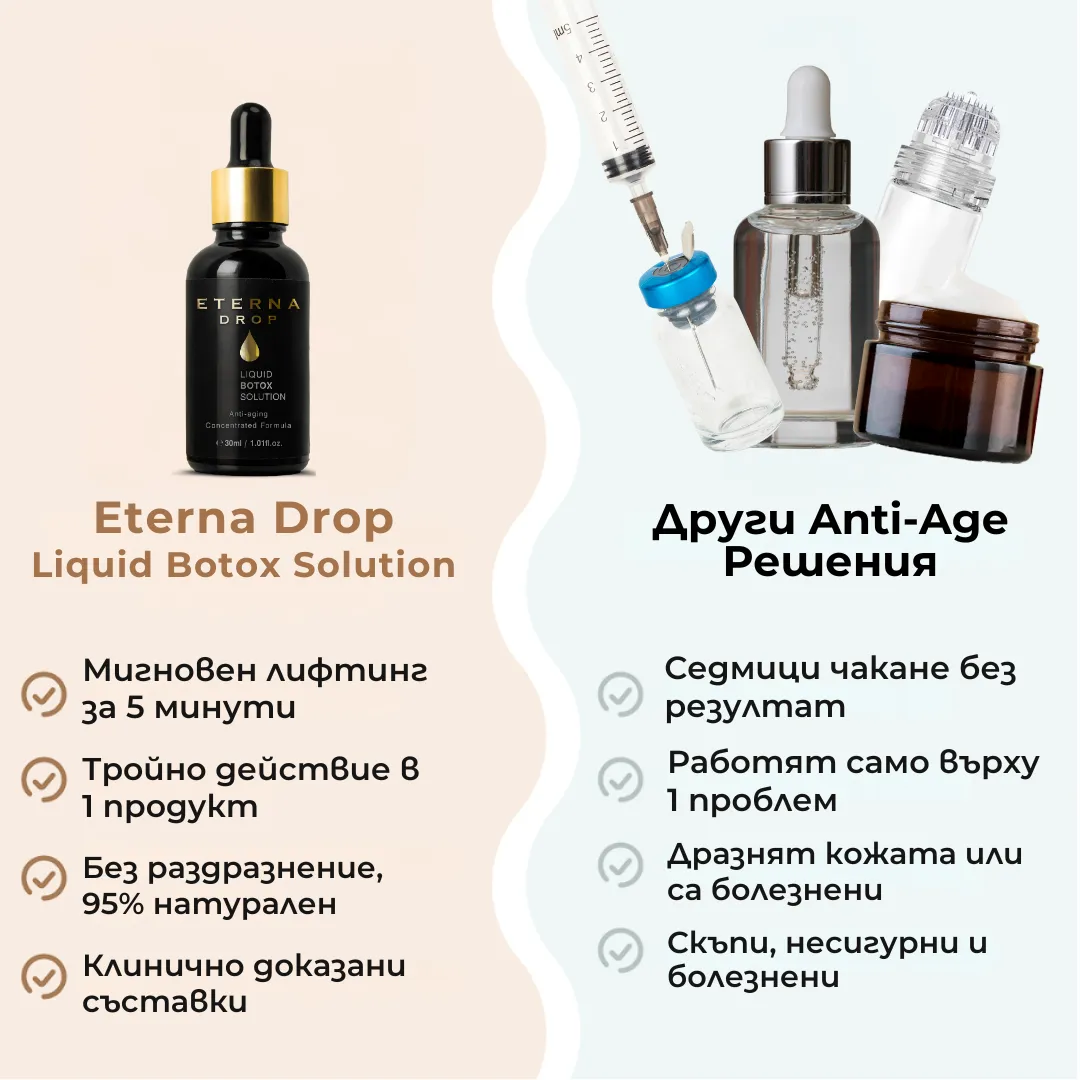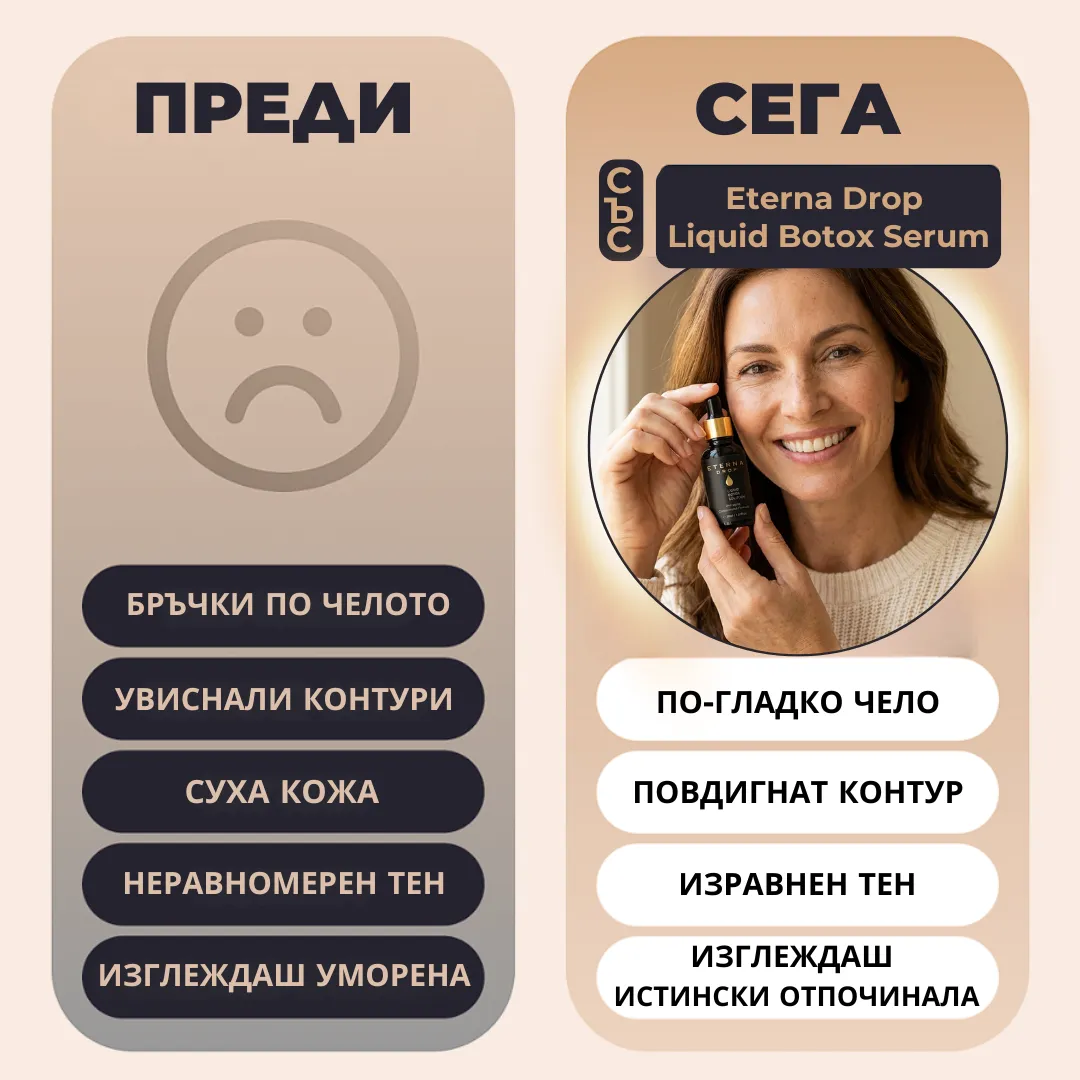 Представяме ви серума на: Eterna Drop Liquid Botox Solution научно формулиран да се бори с разпада на колагена и да трансформира кожата Ви по начини, които никога не сте мислили за възможни: