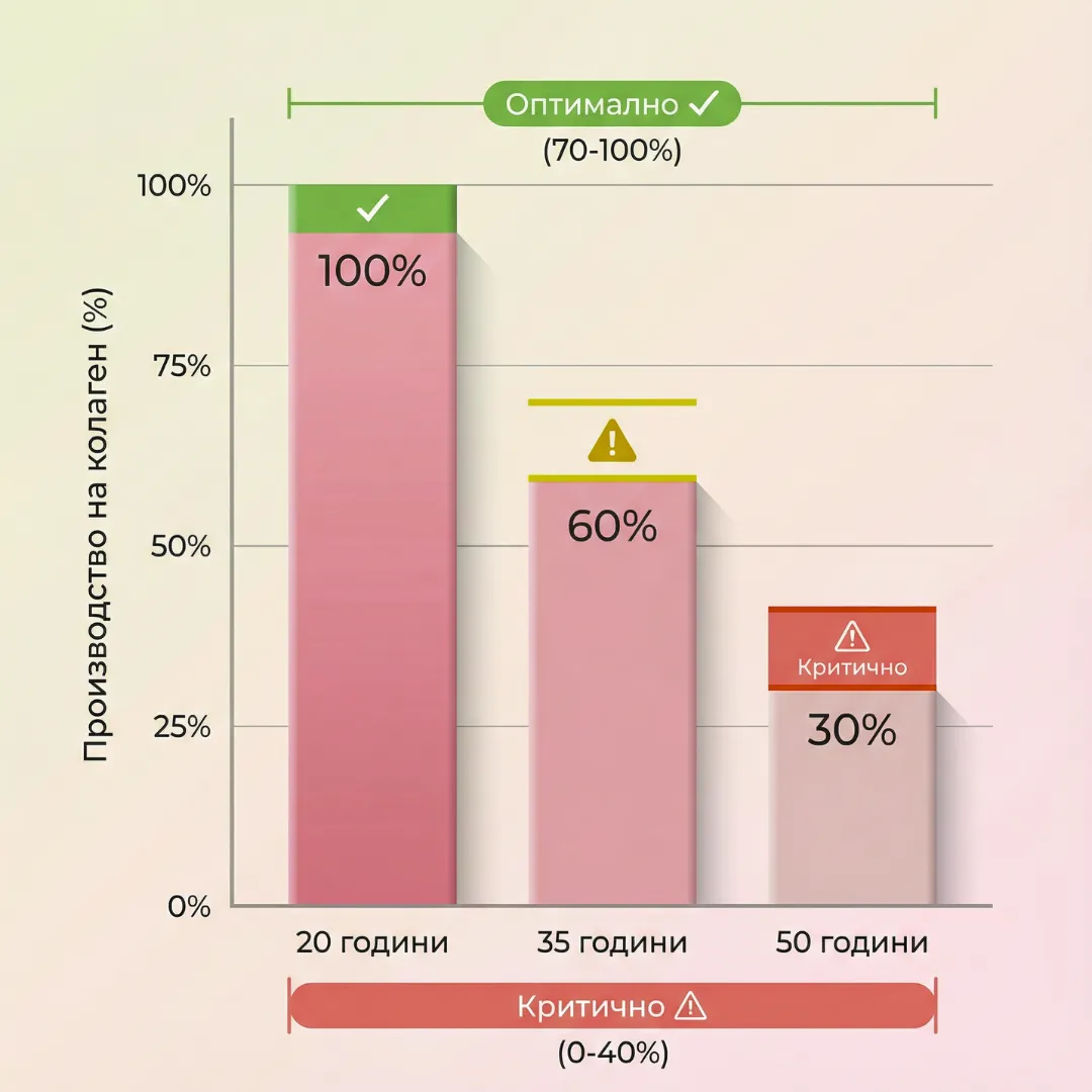 Всъщност този срив тихомълком разрушава структурата на кожата Ви, намалявайки производството на колаген до едва половината от първоначалния капацитет.